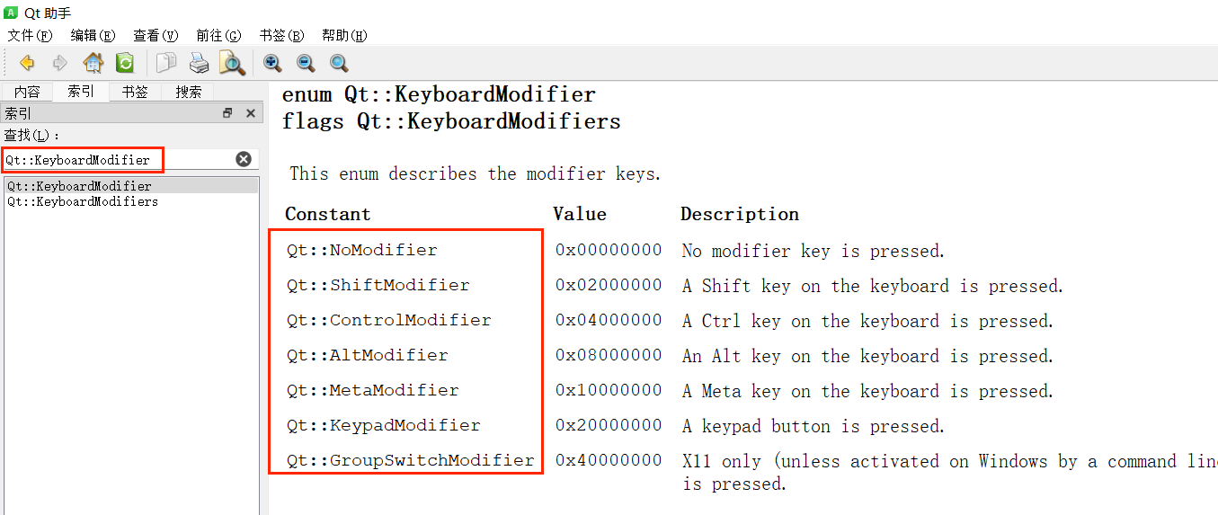 在帮助文档中查找 QKeyEvent 类如下: