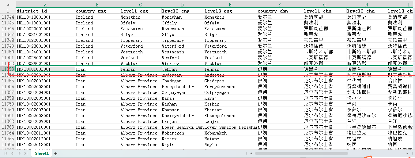 该查询方式适合固定海外城市、业务系统配置化查询场景,只需提前获取目标海外城市的district_id,传入方法即可快速获取精准天气数据,数据稳定无延迟。海外城市的行政区划id百度提供了完整的列表,大家下载到本地即可,这里以伊朗首都德黑兰为例,在Excel表格中查找到具体的区划编码,如下: