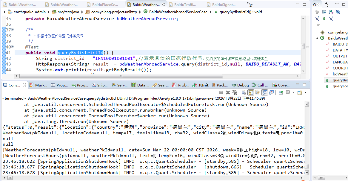 封装专属天气查询工具类,整合两种查询方式,将AK和接口地址抽离为演示示例,便于后期维护,代码结构清晰,直接调用对应方法即可获取海外天气数据,新手也能快速上手。这里使用Junit的测试集成方式进行演示。核心代码如下: