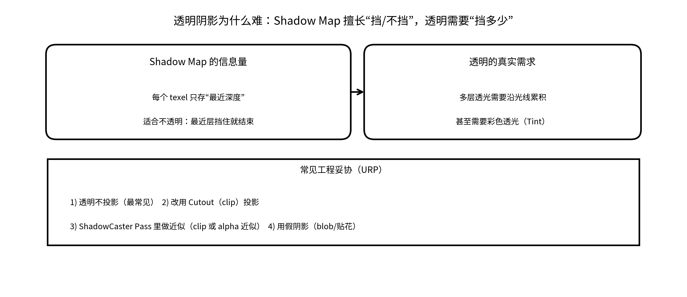 - Shadow Map 擅长回答"挡 / 不挡"(近似二值遮挡)
