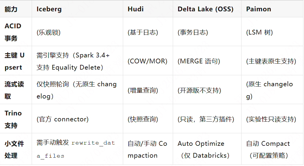 注:Delta Lake OSS = 开源版;Paimon Trino 支持参考 Trino #18942