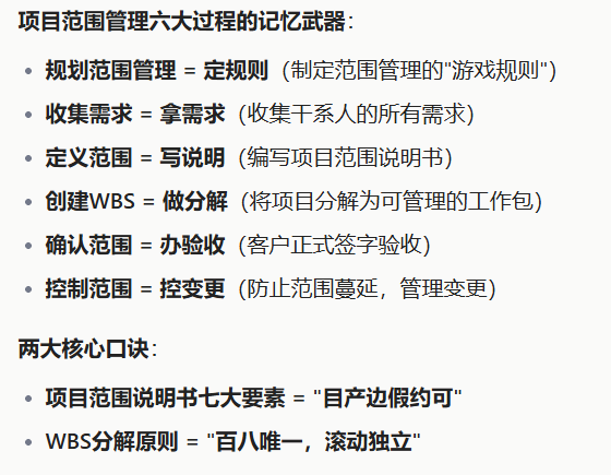- 基准锚定:范围基准是项目执行的"宪法",WBS是分解工作的核心工具;