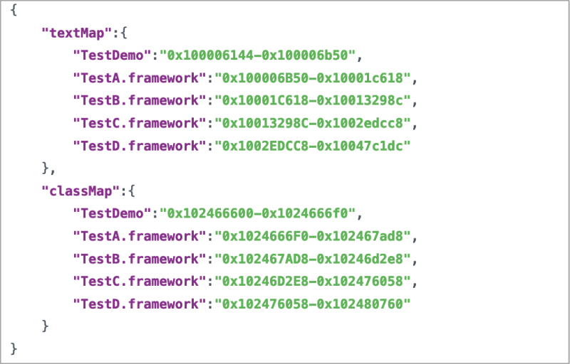 如果对每个类都标记库名会使生成的ClassMap文件会过大,对包体积影响较大。通过分析APP的编译过程,发现静态库是顺序编译,在每个Section下静态库也都是分段的,所以最终通过计算每个静态库的偏移地址和大小来生成静态库的位置标记。