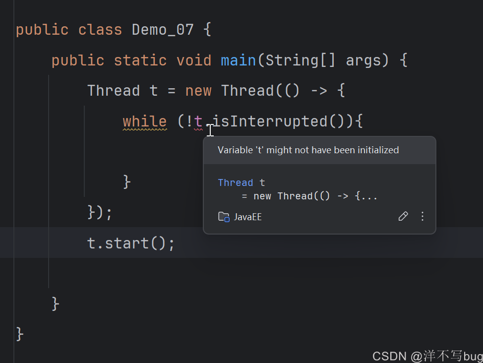 但是这里在lambda表达式的while中直接使用却会报错,因为这个lambda表达式的定义,是在new Thread之前的,所以这个t对象在while中调用的时候还没有被初始化呢,如下所示:
