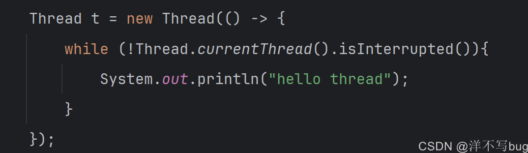 - t线程没有执行sleep等阻塞操作,t的isInterrupted()方法返回true,通过循环条件来结束t线程