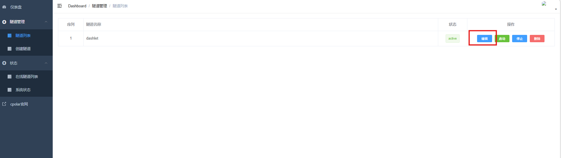 登录cpolar web UI管理界面,点击左侧仪表盘的隧道管理------隧道列表,找到所要配置的隧道,点击右侧的编辑。
