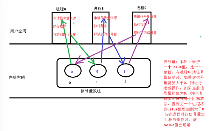 2、信号量集的使用,本质上是对多个value值进行管控,每个信号量控制一个进程,在进程执行 前,申请一个信号量的资源,执行后,释放另一个信号量的资源