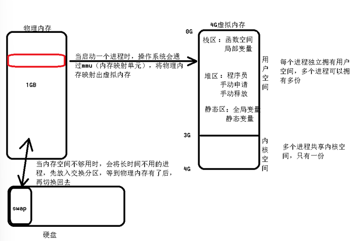 3>其中多个进程中0--3G的用户空间是相互独立的,但是,3--4G的内核空间是相互共享的 用户空间细分为:栈区、堆区、静态区