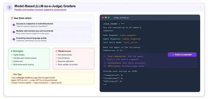确定性(基于代码的)评分器快速、便宜、可重现且客观。它们是你的第一道防线。