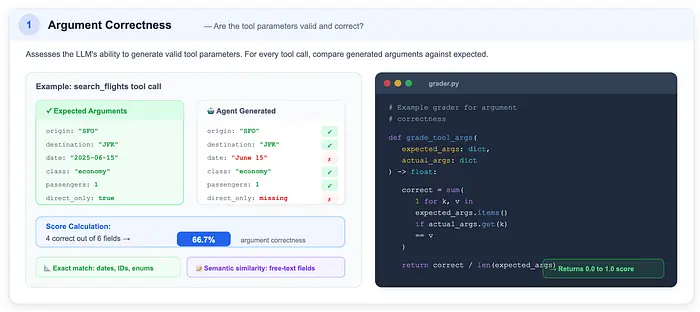 参数正确性评估LLM生成有效工具参数的能力。对于追踪中的每个工具调用,你将生成的参数与预期参数进行比较。对于结构化字段(日期、ID、枚举值)可以用精确匹配测量,对于自由文本字段可以用语义相似度测量。