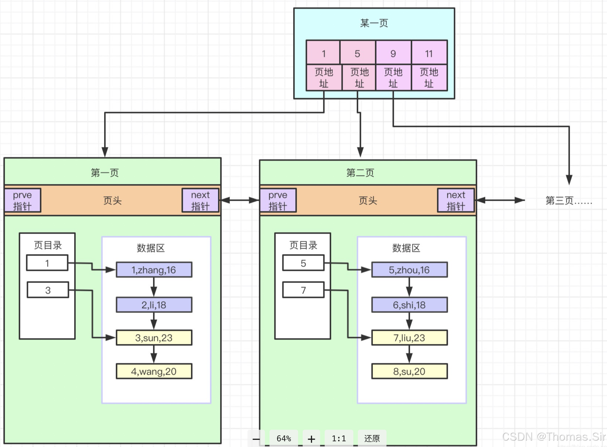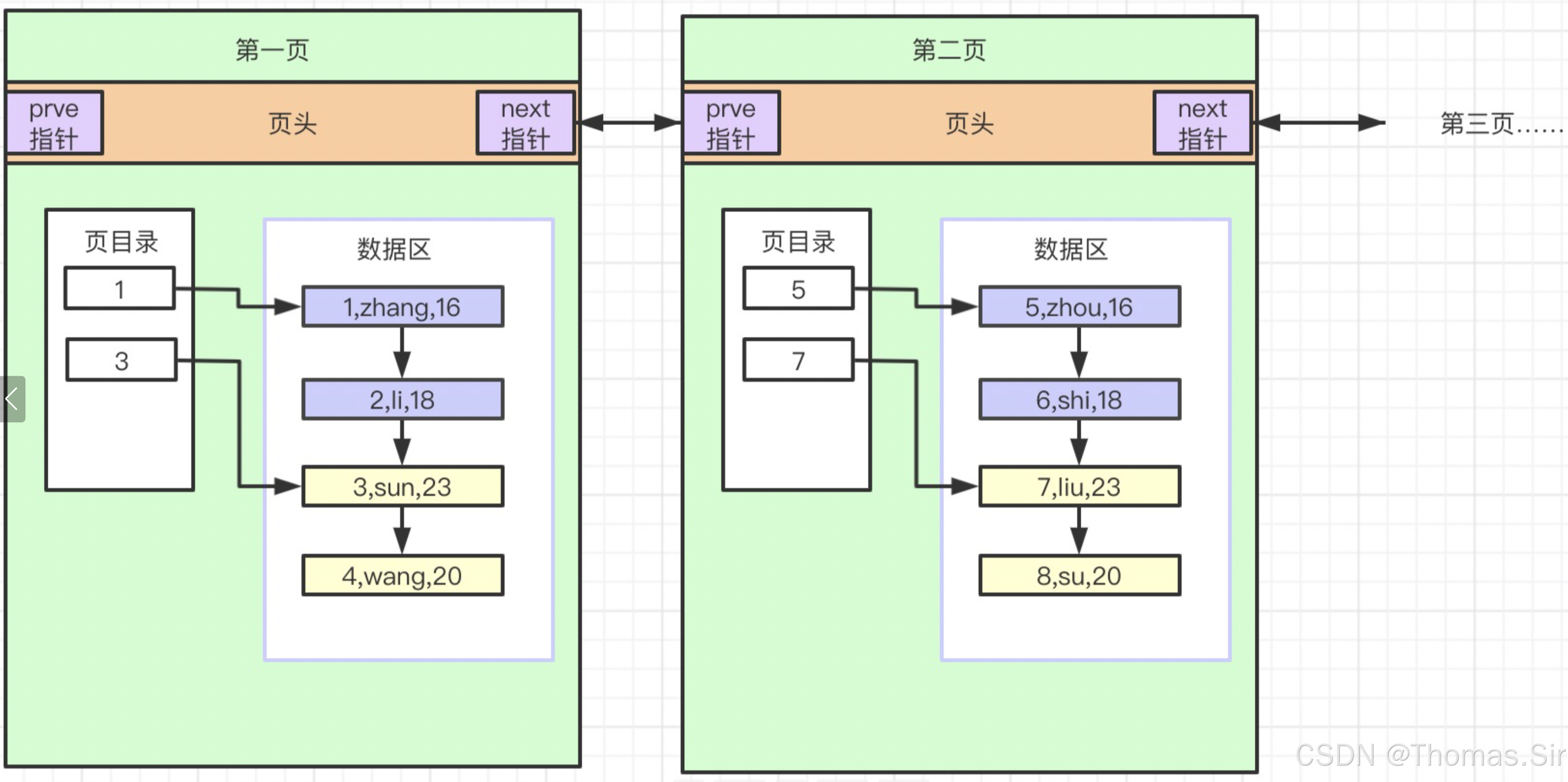 当一页存满之后,数据会存放到下一页,通过双向指针连接,如图: