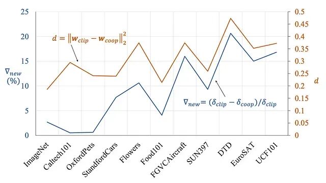 新类别性能损失的程度(▽new)与可学习 Prompt 嵌入(w coop) 和原始手工 CLIP 嵌入(w clip) 之间的欧几里得距离直接一致。