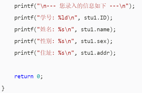 printf("\n--- 您录入的信息如下 ---\n");