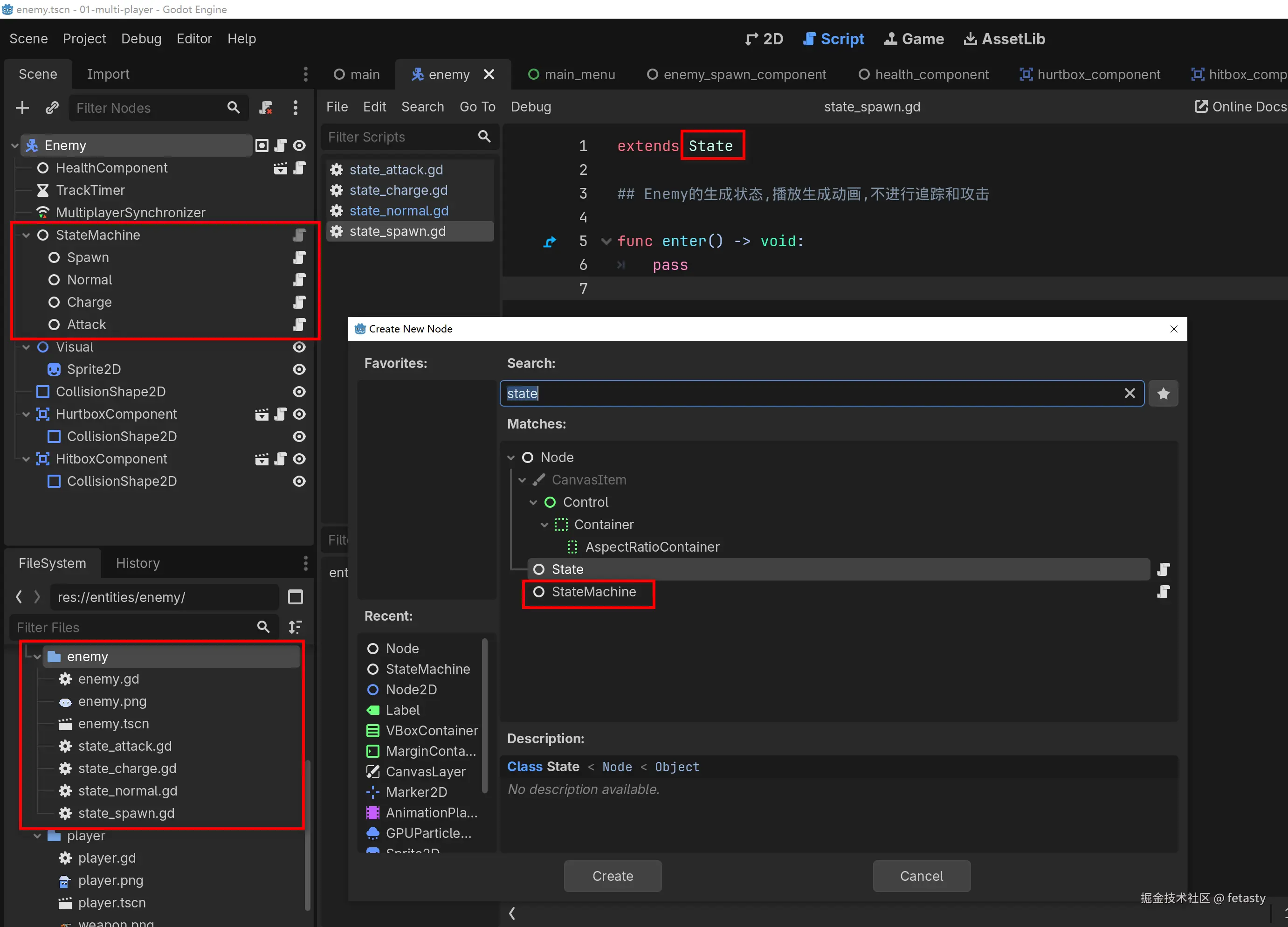 在Enemy场景中直接添加新节点, 搜索StateMachine, 因为这是一个显式赋予了类名的类, 并且继承于Node, 因此可以直接找到这个类并实例化节点