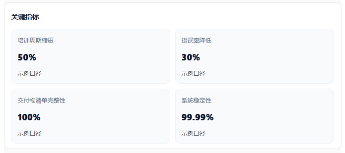 以"示例口径"来衡量:培训周期缩短50%示例口径 错误率降低30%示例口径 交付物清单完整性100%示例口径 系统稳定性99.99%示例口径 更重要的是,把它落到"交付物清单---验收口径---证据链"三件套上:交付什么(如数字化手册、三维技术图册、3D作业指导、VR培训脚本)、怎么验收(版本、工序、岗位与数据口径一致)、如何追溯(来源、变更与责任边界清晰),才能真正让VR/AR工业应用从展示走向生产工具。