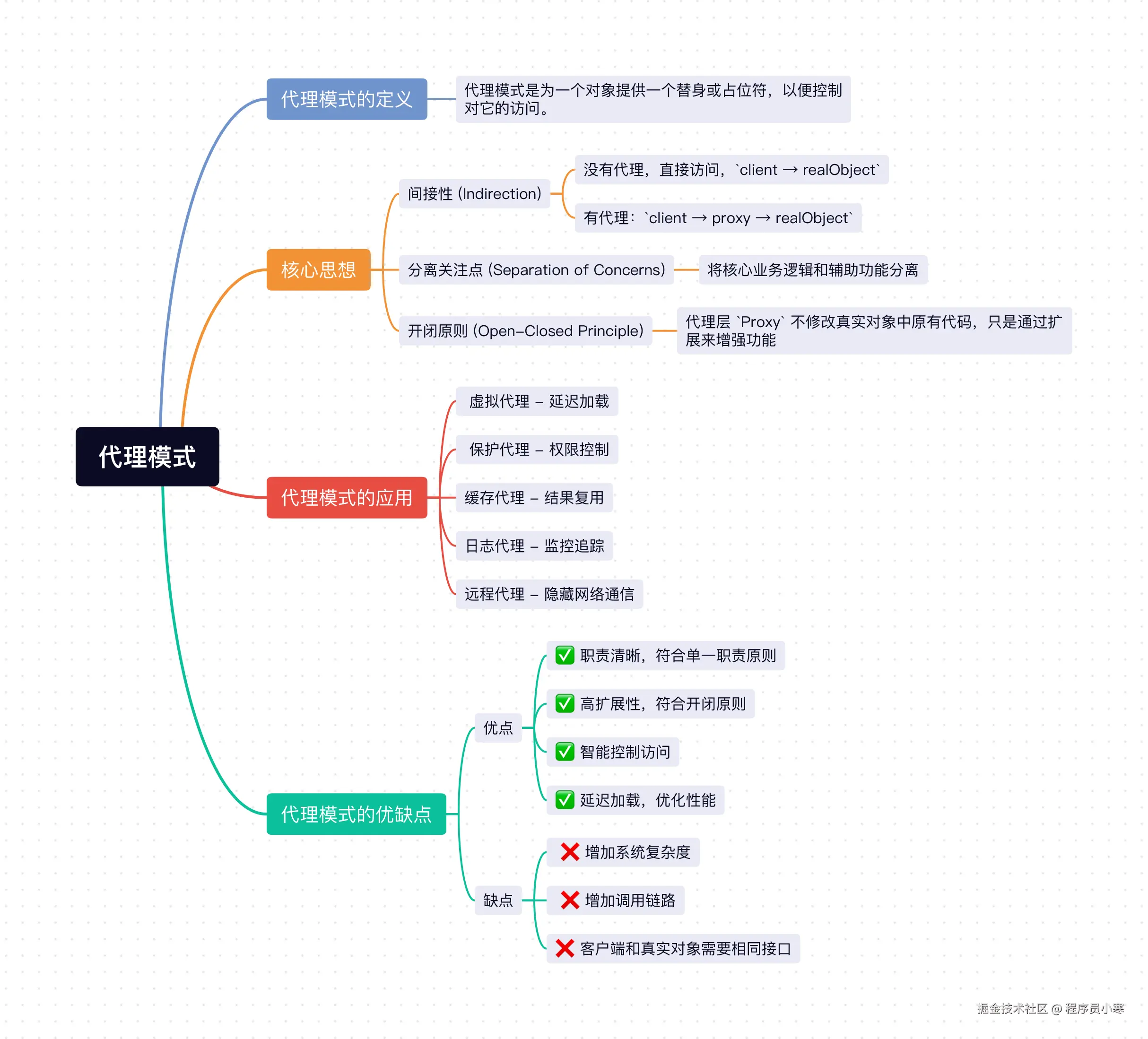 - ✅ 职责清晰,符合单一职责原则:代理模式将核心业务逻辑与辅助功能分离,代理层实现辅助功能,核心业务逻辑由真实对象来完成,职责分明。