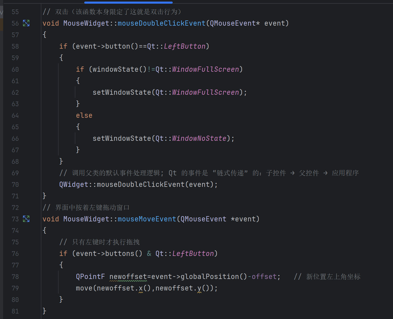 子类处理事件后,建议调用父类内容(可能父类有一些新的需求/行为),Qt 的事件处理是 "链式" 的,父类实现包含了控件正常工作的基础逻辑