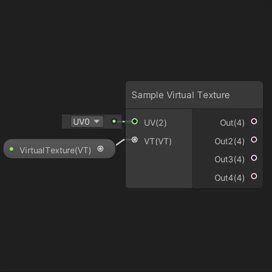 Out 输出端口提供虚拟纹理中第 1 层的 RGBA 采样结果。这个端口通常用于基础颜色或漫反射纹理,是大多数材质着色器的主要输入。输出值的范围取决于纹理数据的编码方式,通常是 0 到 1 的线性空间值,但也可能是其他颜色空间,如 sRGB。