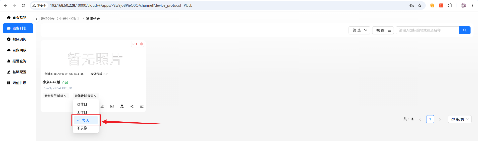 点击播放图标,点击进入,然后可以看到录像计划显示为未录像,这里直接将其设置为,这样就会一直录制啦:
