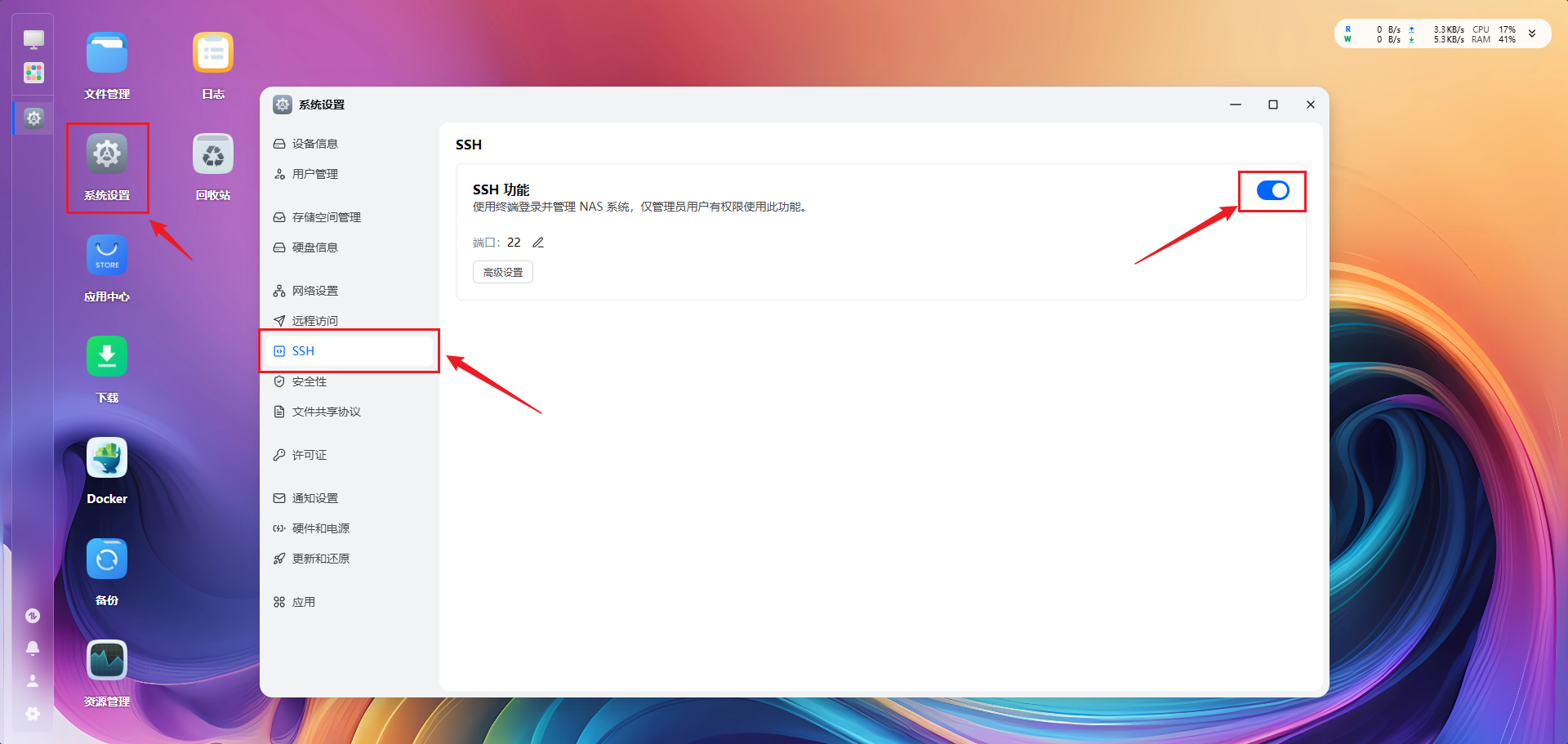 进入飞牛Nas的系统设置,来到SSH项,将SSH功能设置为启用 :