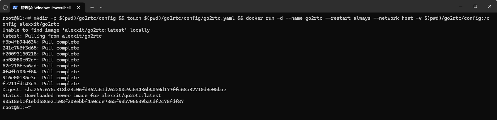 命令会进行创建**/go2rtc/config目录和创建 go2rtc.yaml**配置文件,并且执行Docker一键部署命令,如下图: