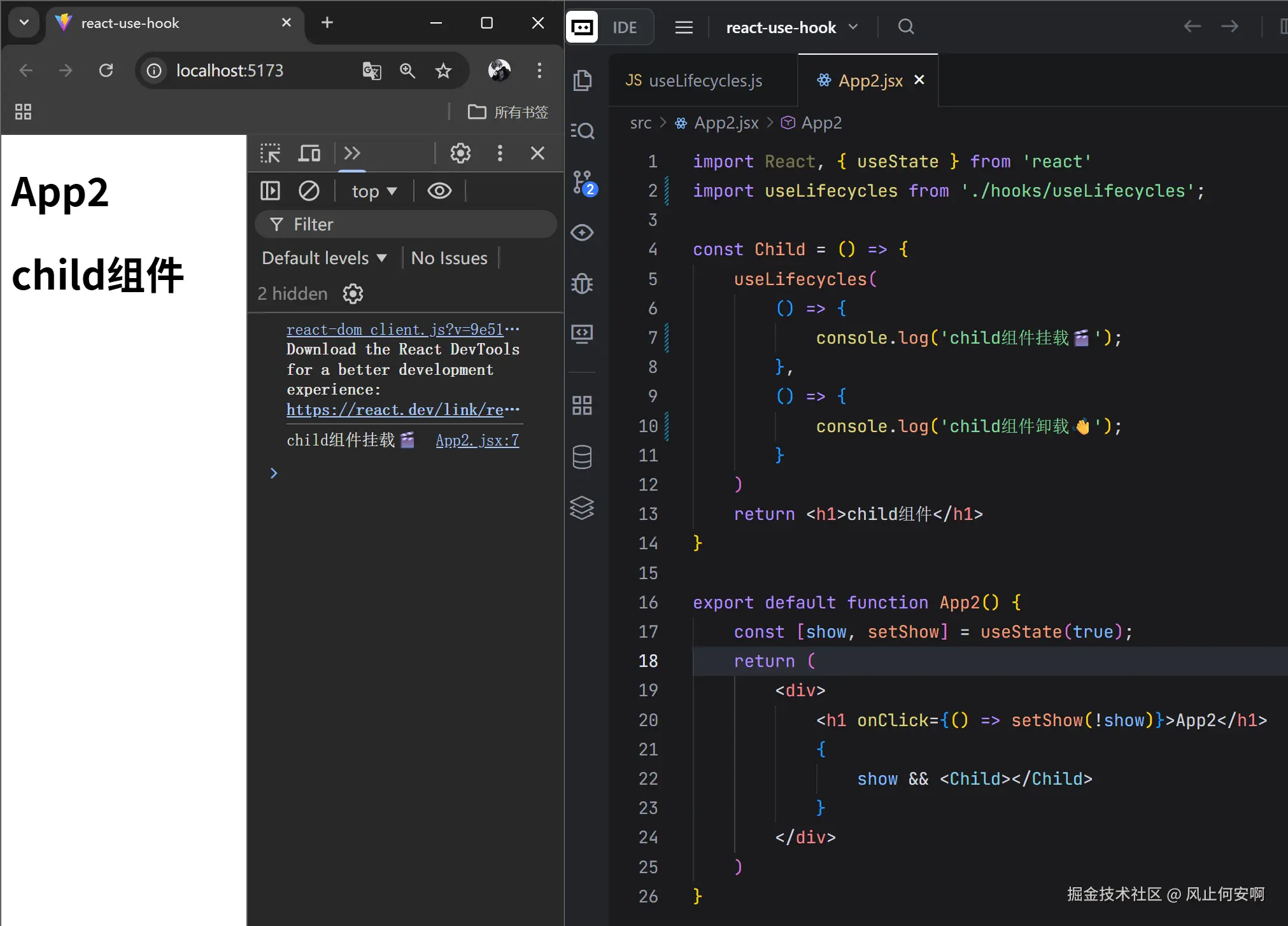 当点击App2时,child组件消失 (卸载) ,打印child组件卸载 👋: