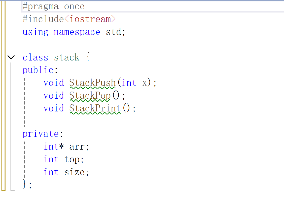 使用class关键字命名类,类中的成员变量默认是私有的,类中的成员函数默认是inline函数,如下图,简单定义了一个stack类,成员变量有一个数组,表示栈顶的top,表示栈大小的size