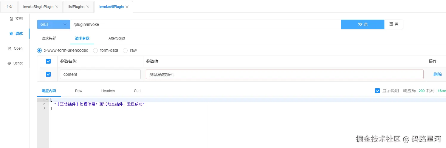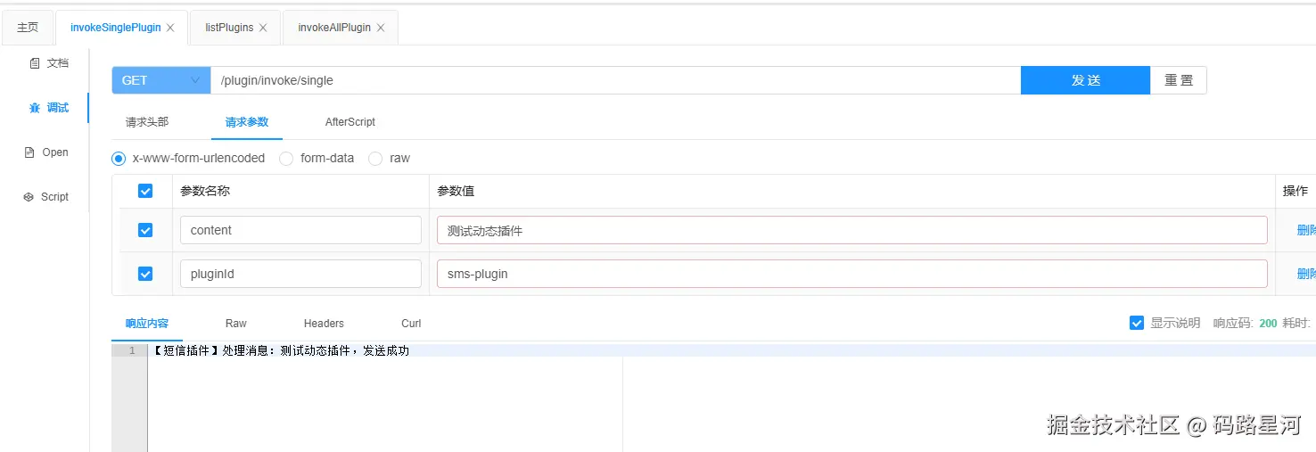 - 指定调用:GET /plugin/invoke/single?content=测试动态插件&pluginId=sms-plugin