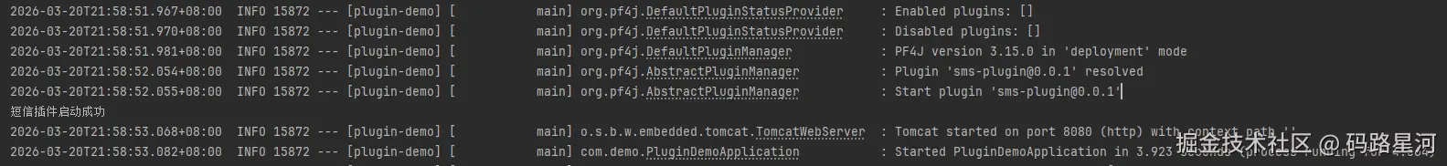 启动 SpringBoot 主应用,控制台打印插件启动日志,代表加载成功: