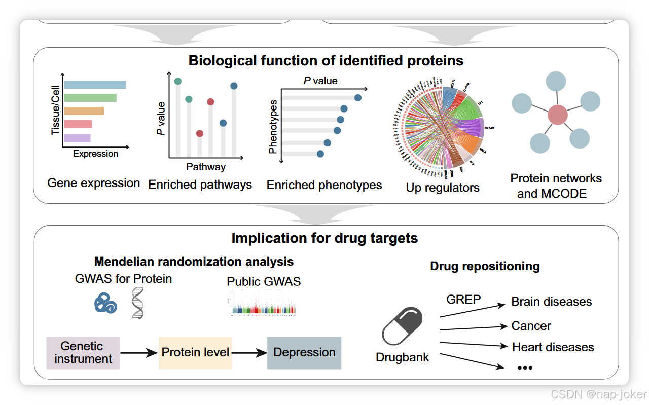 图1。学习概述。上部面板:本研究使用的数据,包括抑郁症诊断和自我报告问卷信息、基因型数据、蛋白质组学数据、脑MRI数据及压力相关事件。中上左面板:利用Cox比例风险回归模型识别与发发性抑郁相关的重要蛋白。中上右面板:研究考察了血浆蛋白与抑郁相关表型(包括脑结构、遗传和环境因素)之间的关联。中下组:通过多种分析,如组织/细胞表达分析、通路富集分析、表型富集分析和上调蛋白富集分析,探讨了已识别蛋白的生物功能,以深入了解其在抑郁症中的潜在作用和分子机制。底部面板:使用孟德尔随机化分析探讨血浆蛋白与抑郁症之间的潜在因果关系,旨在揭示潜在的抑郁症药物靶点。此外,利用DrugBank的数据进行了药物定位分析,探索具有治疗抑郁潜力的现有药物。