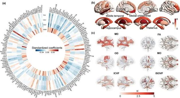为阐明血浆蛋白与发作抑郁症之间的关系,我们利用4948名在基线评估前或基线评估时未被诊断为抑郁症的参与者,结合蛋白质和影像数据,考察了已知抑郁相关蛋白与大脑结构之间的关联(方法)。经过FDR修正后,157个蛋白质中有50个与至少一项全球大脑结构测量中的一项相关。总体而言,较高的抑郁风险蛋白水平与总灰质体积(GMV)、皮层及皮层下GMV以及白质高强度体积(WMH)增加显著相关(图3a;表S12在线)。值得注意的是,GDF15、PLAUR、TFF3、TGFA、CSF1和AREG水平较高与较低的GMV密切相关,而NEFL水平较高则与白细胞生长体积增加的关联最为显著。此外,BCAN水平更高,ITGA11和ITGAV也与灰质体积增加相关。我们进一步考察了脑结构的区域性指标,包括灰质(体积、表面积、皮层厚度)与白质指标(包括各向异性分数、平均扩散率MD)之间的关联(方法)。经过FDR校正后,我们识别出64种蛋白质与至少一个脑区域指标有显著关联。值得注意的是,在这些关联中,BCAN、ITGA11、GDF15、LRRN1、NEFL和AREG与至少八个脑结构有显著关联。此外,我们还观察到148项脑区域指标与至少一种血浆蛋白之间存在显著关联。在68个脑皮层区域的体积中,涉及抑郁的几个脑区,包括左中颞回、左侧眼窝额回和右前方中额回,与三种以上蛋白质相关(图3b;表S13在线)。对于16个大脑皮层下区域,如双侧丘脑、双侧海马和双侧侧脑室等区域与三种以上蛋白质相关(图3b;表S13在线)。在27条主要通道中,包括双侧前丘脑放射、双侧后丘脑放射、双侧下纵束、左上方纵束、双侧上丘脑放射、左皮质脊髓束和带皮带回部分,至少与三种蛋白质相关(图3c;表S13在线)。这些发现凸显了抑郁相关蛋白与多个脑区之间复杂的关系,这些区域与抑郁症的发病机制有关