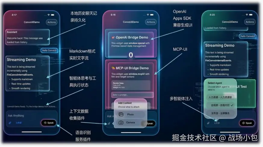 移动端入口往往决定 AI 的覆盖率。很多企业不希望员工额外下载新工具,而是希望把 Claw 嵌入已有的工作平台------飞书、钉钉、企微。比如凡泰极客的 FinClip ChatKit SDK 就是这个思路,面向 iOS 和 Android 提供移动端接入层,让员工在熟悉的业务界面里自然调用 AI。