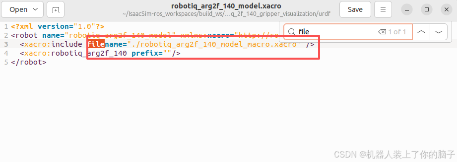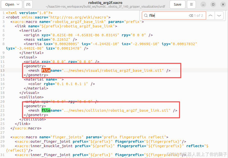 进入包目录下robotiq/robotiq_2f_140_gripper_visualization/urdf,将四个文件内filename路径修改为下图样式,注意不要遗漏