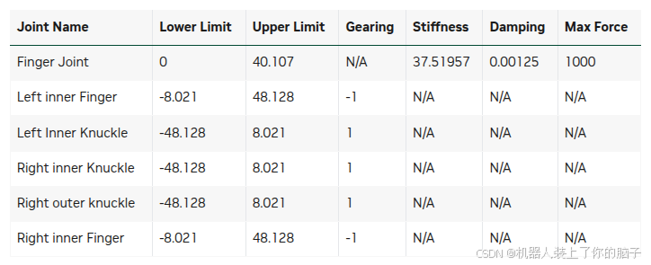 /robotiq_arg2f_140_model/joints/finger_joint**含义:**这是"领头羊"。所有的从动关节都会盯着这个关节。当这个关节转动 1°,其他从动关节会根据传动比(Gearing)跟着转。