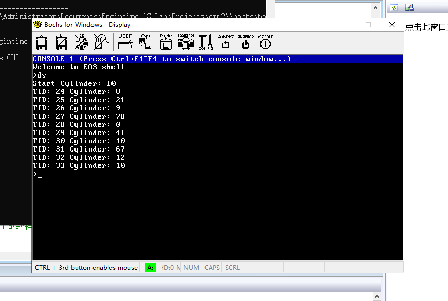 | ## 三、实验项目摘要 1. 3.2 验证先来先服务(FCFS)磁盘调度算法 1. 在"项目管理器"窗口中双击 ke文件夹中的 sysproc.c文件,打开此文件。 2. 在 sysproc.c文件的第 575行找到控制台命令"ds"对应的函数 ConsoleCmdDiskSchedule。"ds" 命令专门用来测试磁盘调度算法。阅读该函数中的源代码,目前该函数使磁头初始停留在磁道 10, 其它被阻塞的线程依次访问磁道 8、21、9、78、0、41、10、67、12、10。 3. 打开 io/block.c文件,在第 391行找到磁盘调度算法函数 IopDiskSchedule。 4. 打开 io/block.c 文件,在 IopProcessNextRequest 函数中的第 249 行的代码处添加一个断点。 当 ds命令执行完毕后会命中此断点,方便读者查看磁盘调度运行的结果。 5. 按 F7生成项目,然后按 F5启动调试。 6. 待 EOS启动完毕,在 EOS控制台中输入命令"ds"后按回车,会命中刚刚添加的断点。 7. 激活虚拟机窗口,在 EOS 控制台中会首先显示磁头的起始位置是 10 磁道,然后按照线程创建的 顺序依次显示线程的信息(包括线程 ID和访问的磁道号)。 8. 选择"调试"菜单"窗口"中的"磁盘调度",打开"磁盘调度"窗口,点击该窗口工具栏上的 "刷新"按钮,可以看到磁头的起始位置,以及线程依次访问磁道时,磁头移动的轨迹。 对比 EOS 控制台和"磁盘调度"窗口中的内容,可以发现 FCFS 算法是根据线程访问磁盘的先后顺序 进行调度的。 2. 3.3 验证最短寻道时间优先(SSTF)磁盘调度算法 使用 OS Lab打开"学生包"本实验文件夹中的 sstf.c文件(将 sstf.c文件拖动到 OS Lab窗口中释 放即可)。该文件提供的 IopDiskSchedule函数实现了 SSTF磁盘调度算法。 变量 Offset是有符号的长整型,用来表示磁头的偏移(包括距离和方向)。Offset大于 0 时表示 磁头向内移动(磁道号增加);小于 0 时表示磁头向外移动(磁道号减少);等于 0 时表示磁头没 有移动。而名称以"Distance"结尾的变量都是无符号长整型,只表示磁头移动的距离(无方向)。 所以在比较磁头的偏移和距离时,或者在将偏移赋值给距离时,都要取偏移的绝对值(调用 C 库 函数 abs)。本实验在实现其它磁盘调度算法时也同样遵守此约定。 在开始遍历之前,将最小距离(ShortestDistance)初始化为最大的无符号长整型数,这样,第 一次计算的距离一定会小于最小距离,从而可以使用第一次计算的距离来再次初始化最小距离。 本实验在实现其它磁盘调度算法时也同样使用了此技巧。 按照下面的步骤进行验证: 1. 使用 sstf.c文件中 IopDiskSchedule函数的函数体,替换 block.c文件中 IopDiskSchedule函 数的函数体。 2. 按 F7生成项目,然后按 F5启动调试。 3. 待 EOS启动完毕,在 EOS控制台中输入命令"ds"后按回车,仍然会命中之前添加的断点。 4. 刷新"磁盘调度"窗口,可以看到磁头移动的轨迹对比 EOS控制台和"磁盘调度"窗口中的内容(特别是线程 ID的顺序),可以发现,SSTF算法唤醒线 程的顺序与线程创建的顺序是不同的。对比 SSTF算法与 FCFS算法在"磁盘调度"窗口中的内容,可以看 出,SSTF算法的平均寻道数明显低于 FCFS算法。 3. 3.4 验证 SSTF算法造成的线程"饥饿"现象 使用 SSTF 算法时,如果不断有新线程要求访问磁盘,而且其所要访问的磁道与当前磁头所在磁道的 距离较近,这些新线程的请求必然会被优先满足,而等待队列中一些老线程的请求就会被严重推迟,从而 使老线程出现"饥饿"现象。 按照下面的步骤进行实验,观察这个现象: 1. 修改 sysproc.c文件 ConsoleCmdDiskSchedule函数中的源代码,仍然使磁头初始停留在磁道 10, 而让其它线程依次访问磁道 78、21、9、8、11、41、10、67、12、10。 2. 按 F7生成项目,然后按 F5启动调试。 3. 待 EOS启动完毕,在 EOS控制台中输入命令"ds"后按回车,仍然会命中之前添加的断点。 4. 刷新"磁盘调度"窗口,可以看到磁头移动的轨迹。 查看"磁盘调度"窗口中显示的内容,可以发现,虽然访问 78 号磁道的线程的请求第一个被放入请 求队列,但却被推迟到最后才被处理,出现了"饥饿"现象。如果不断有新线程的请求到达并被优先满足, 则访问 78号磁道的线程的"饥饿"情况就会更加严重。 将"磁盘调度"窗口中的内容保存到一个图像文件中,然后结束此次调试。将 ConsoleCmdDiskSchedule 函数中线程访问的磁道号恢复到本实验 3.2中的样子,在后面的实验中还要使用这些数据 4. 3.5 验证扫描(SCAN)磁盘调度算法 对 SSTF算法稍加改进后可以形成 SCAN算法,可防止较早发出磁盘访问请求的线程出现"饥饿"现象。 使用 OS Lab打开"学生包"本实验文件夹中的 scan.c文件,该文件提供的 IopDiskSchedule函数实现了 SCAN磁盘调度算法。在阅读此函数的源代码时,应该特别注意下面几点: l 在 block.c文件中的第 387行定义了一个布尔类型的全局变量 ScanInside,用于表示扫描算法中 磁头移动的方向。该变量值为 TRUE时表示磁头向内移动(磁道号增加);值为 FALSE时表示磁头 向外移动(磁道号减少)。该变量初始化为 TRUE,表示 SCAN算法第一次执行时,磁头向内移动。 在 scan.c 文件的 IopDiskSchedule 函数中使用了双重循环。第一次遍历队列时,查找指定方向 上移动距离最短的线程,如果在指定方向上已经没有线程,就变换方向,进行第二次遍历,同样 是查找移动距离最短的线程。在这两次遍历中一定能找到合适的线程。 l 按照下面的步骤进行验证: 1. 使用 scan.c文件中 IopDiskSchedule函数的函数体,替换 block.c文件中 IopDiskSchedule函 数的函数体。 2. 按 F7生成项目,然后按 F5启动调试。 3. 待 EOS启动完毕