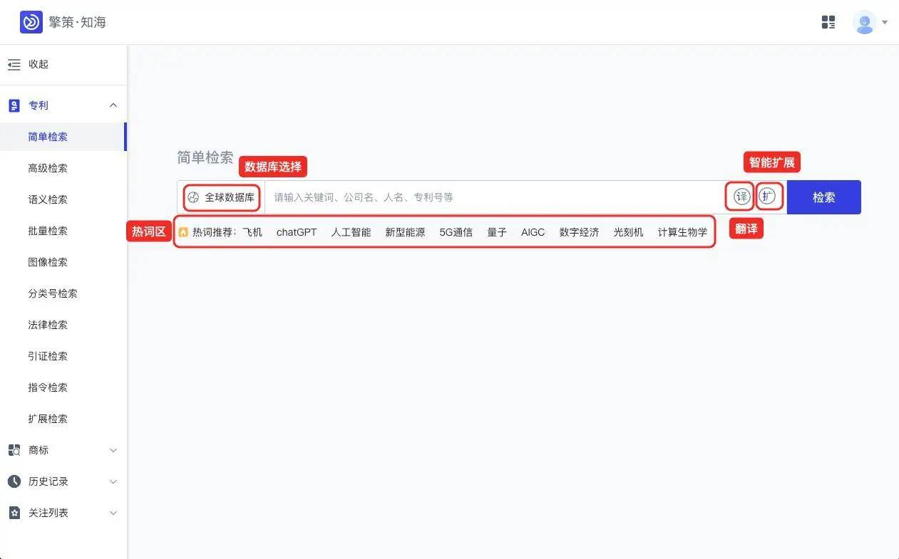 为适配多样化的专利检索场景,擎策·知海全球专利数据库的多元工具形成有效互补,进一步完善专利检索能力。简单检索支持关键词、专利号、公司名、人名等字段的快速专利检索,搭配热词推荐、中英文互译、智能扩展等功能,大幅提升专利检索效率,满足快捷检索需求;批量检索支持号码和申请人两种批量查询模式,号码批量检索单次可输入1000个申请号或公开号,申请人批量检索单次可输入500个相关主体名称,支持多格式分割与号码匹配验证,显著提升批量专利检索的效率;图像检索利用图像处理和计算机视觉技术,支持外观设计和发明/实用新型的专利检索,上传图片即可匹配相似度高的专利数据,还能实现检索结果的二次图像检索,彻底破解图形类专利检索的难题;分类号检索支持IPC、CPC等八大分类规则,可快速定位技术领域,助力精准开展专利检索;法律检索能依据专利法律状态、转让、许可、质押等信息开展检索,为专利检索提供更全面的信息支撑;引证检索可查询专利的引用与被引用情况,判断专利技术影响力;扩展检索可提取关键词并扩展同义词、近义词等,进一步提升专利检索的检全率。