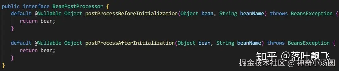 先简单说下 Spring 的 Bean 后处理器------BeanPostProcessor。BeanPostProcessor 是 Spring 中的一个接口,它有 2 个方法: