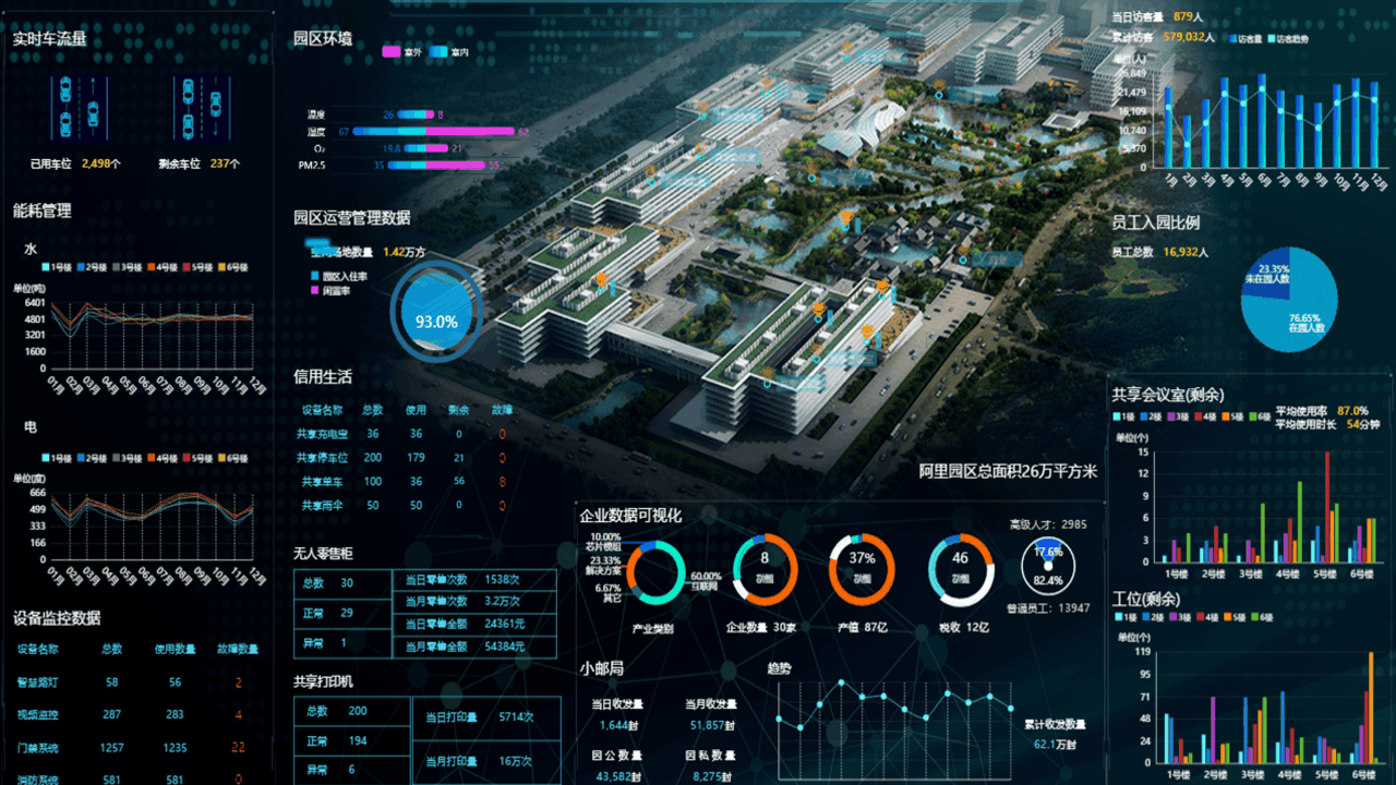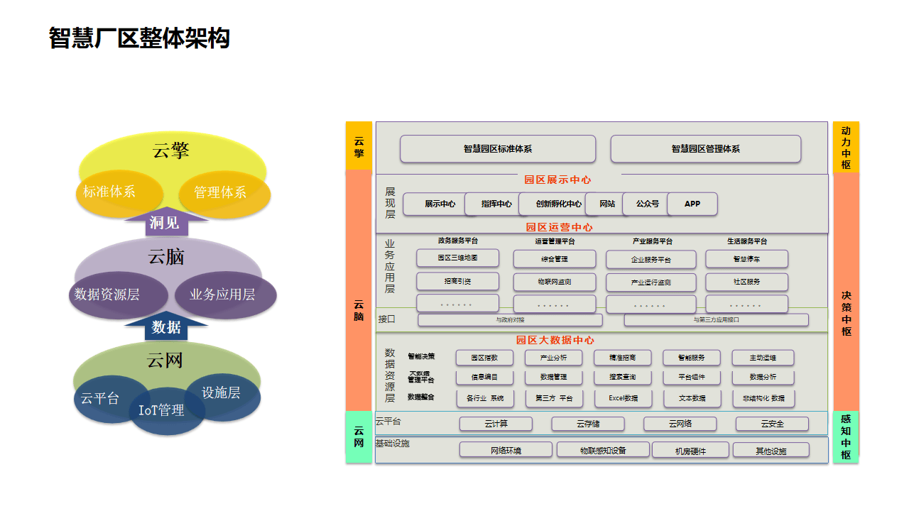 - 展现层 :通过园区展示中心、运营中心、指挥中心 的大屏,以及网站、公众号、APP,将复杂的运行状态以直观、可视化的方式呈现给不同角色的用户。