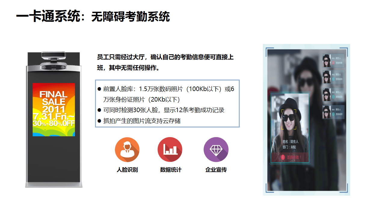 - 无感考勤:员工在进入大厅时自动完成考勤,无需任何操作。