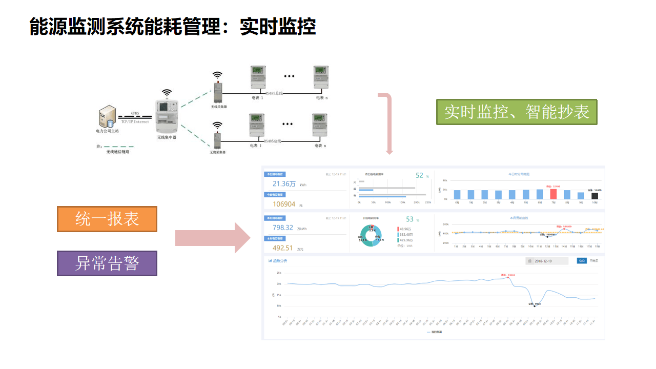 - 异常告警:系统自动识别能耗异常点,并推送告警。
