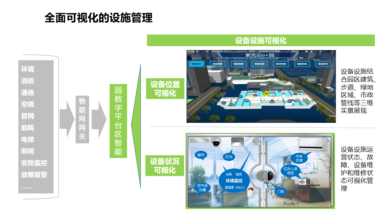 - 对物的智能管理:利用物联网(IoT)技术,为园区内的每一个重要资产(从大型设备到办公家具)和基础设施(水、电、气、暖、管网)赋予"数字身份"和"感知能力"。通过实时监控、预测性维护、电子围栏等手段,实现资产的全生命周期精细化管理。