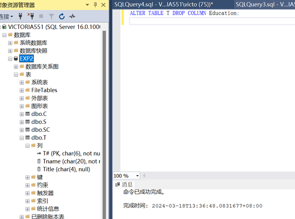 2.2删除T表中的Education列,记录修改语句提交实验报告。