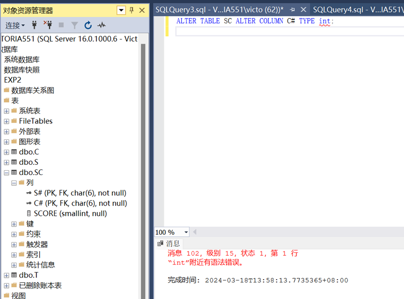 2.4 修改SC表中C#列的类型为int,记录系统出现的提示信息,截屏提交。