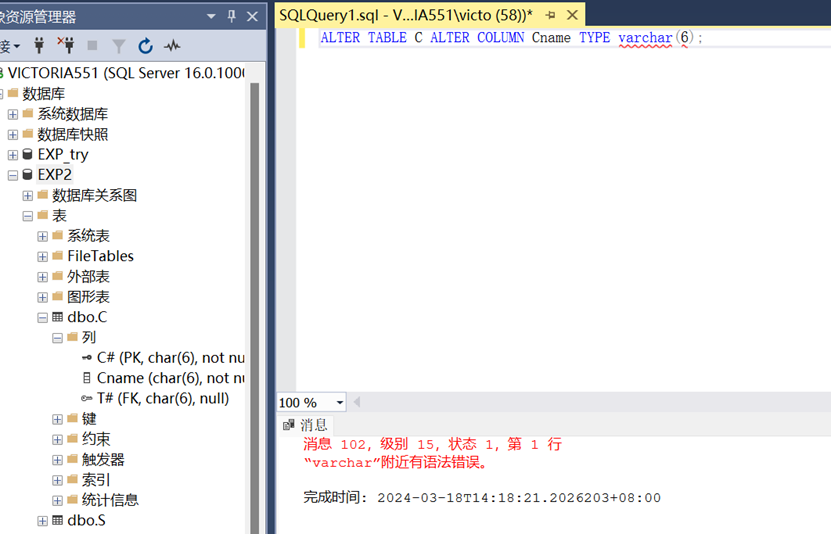 表结构的修改操作是本次实验的另一重要内容,包括添加列、删除列、修改列的数据类型等。在给S表添加age列时,我顺利完成了ALTER TABLE语句的编写和执行;但在删除T表的Education列时,我曾担心删除列会影响表中已有的数据,后来通过查阅资料和实际操作发现,只要该列无关联约束,删除操作不会对其他数据造成影响,这让我对表结构修改的安全性有了更清晰的认识。而在修改SC表中C#列的数据类型时,系统出现了提示信息,经过分析得知,这是因为该列作为外键,与课程表C的C#列存在关联,直接修改数据类型会破坏表间的参照完整性,这一经历让我深刻理解了外键约束对表间关系的保护作用,也意识到在进行表结构修改前,必须先检查表间的关联关系,避免出现数据异常。