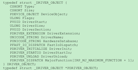 每个驱动程序都有唯一的驱动对象与之对应,驱动对象是驱动在内核中的表示。驱动对象用DRIVER_OBJECT数据结构表示,它作为驱动的一个实例被内核加载,并且内核对一个驱动只加载一个实例驱动对象。确切来说,驱动对象是由内核的对象管理器负责创建,IO管理器负责加载的,驱动程序需要在DriverEntry中进行初始化(由系统进程调用)。