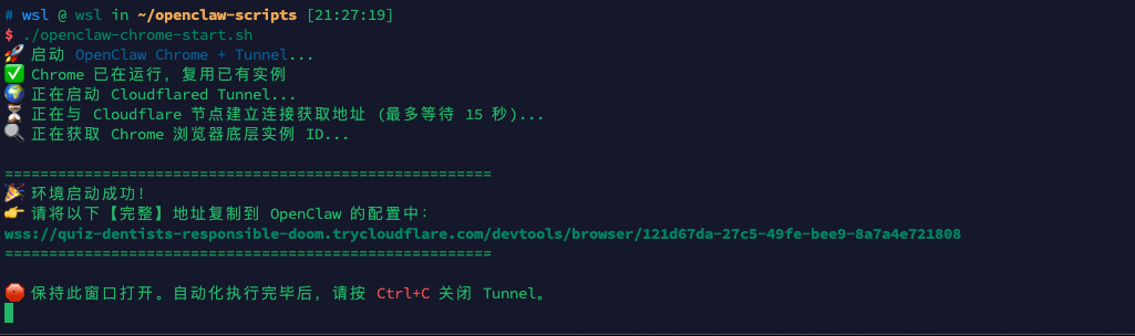 这个脚本将两个进程绑定在一起,实现一键启动 ,它会自动轮询获取 Cloudflare 域名 ,并自动提取 Chrome 底层实例的 UUID 进行完美拼接 。最后,在你按下 Ctrl+C 时它会自动安全销毁 Tunnel 进程,防止端口泄露。