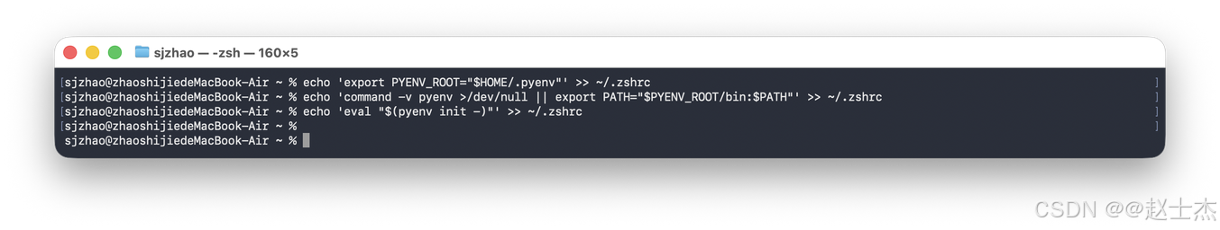 macOS 使用 zsh 终端,无需区分终端类型,直接执行以下命令,将 pyenv 配置写入环境变量文件: