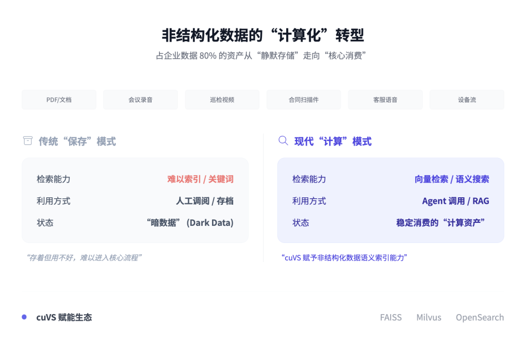 **第二套世界,则是长期被企业"存着但用不好"的非结构化数据世界。**当前,非结构化数据已经占到当今企业数据的 80%,而且还在持续增长;cuVS 面向的就是这类数据背后的向量检索与语义搜索基础能力,包括与 FAISS、Amazon OpenSearch Service、Milvus 等引擎的协同。这里有一个非常重要的变化:过去非结构化数据之所以难以进入企业核心数据体系,不是因为它不重要,而是因为它难以建立统一索引、难以高质量检索、难以被计算流程稳定消费。PDF、制度文档、会议纪要、录音录像、巡检图像、合同扫描件、客服语音、设备视频流,这些东西企业一直在积累,但很长时间里,它们更多只是"被保存下来",而不是"被真正计算"。