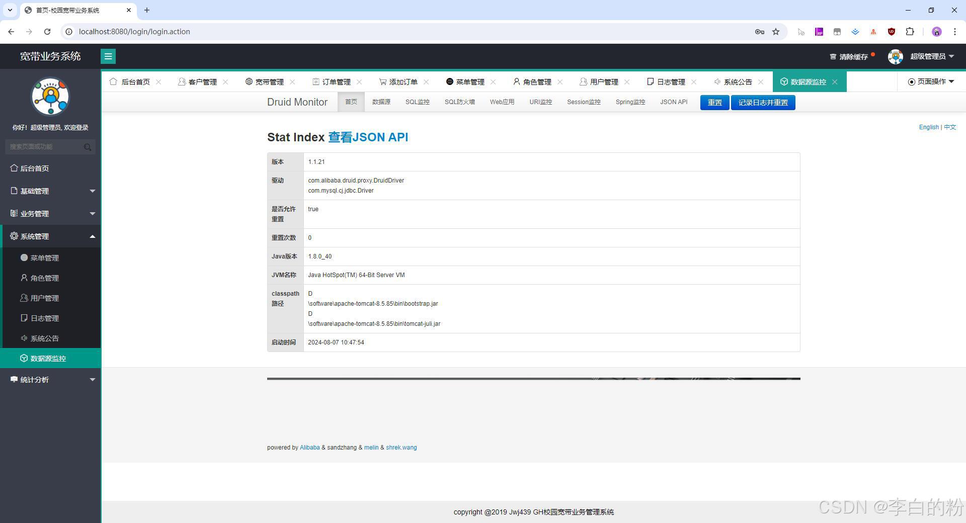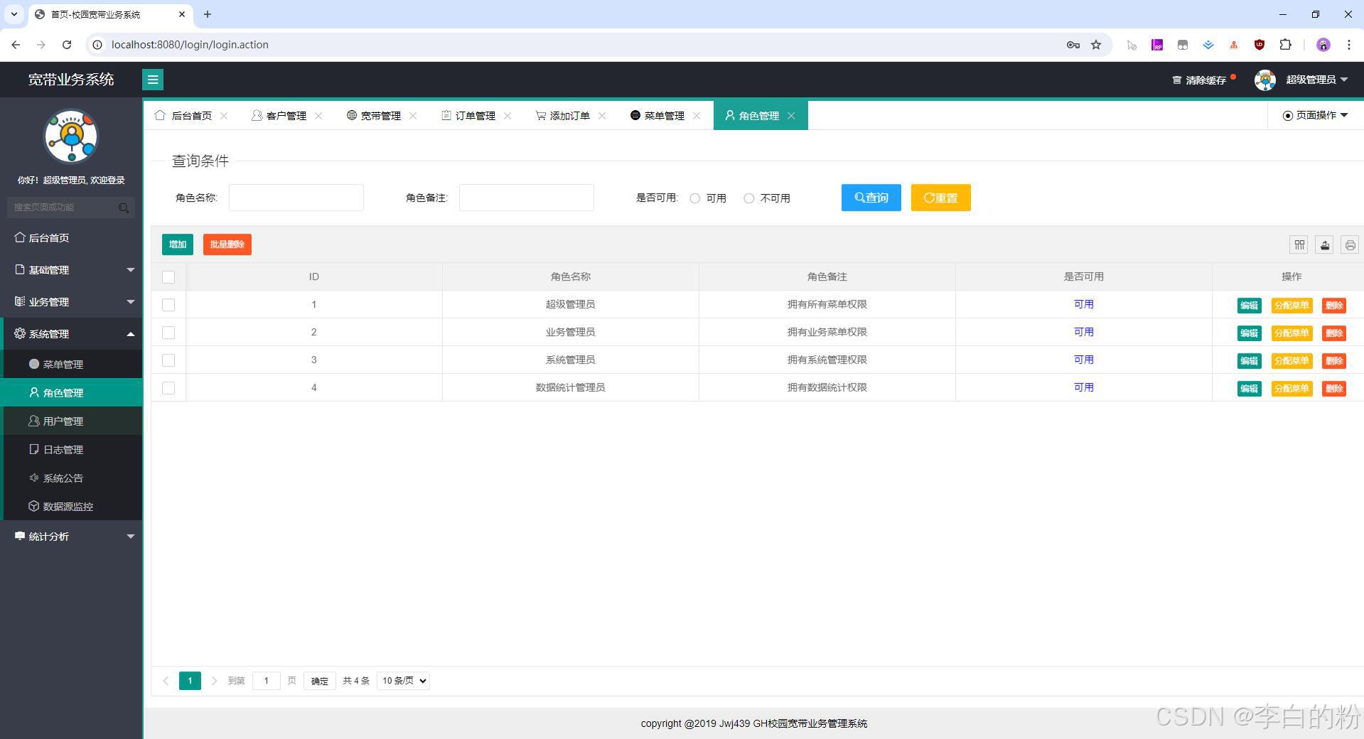 基于ssm的校园宽带业务管理系统,前端采用jsp+layui,后端采用非常经典的SSM框架,系统采用MVC三层架构,角色:超级管理员、业务管理员、系统管理员、数据统计管理员,系统功能齐全,代码简洁易懂,适合小白学编程...