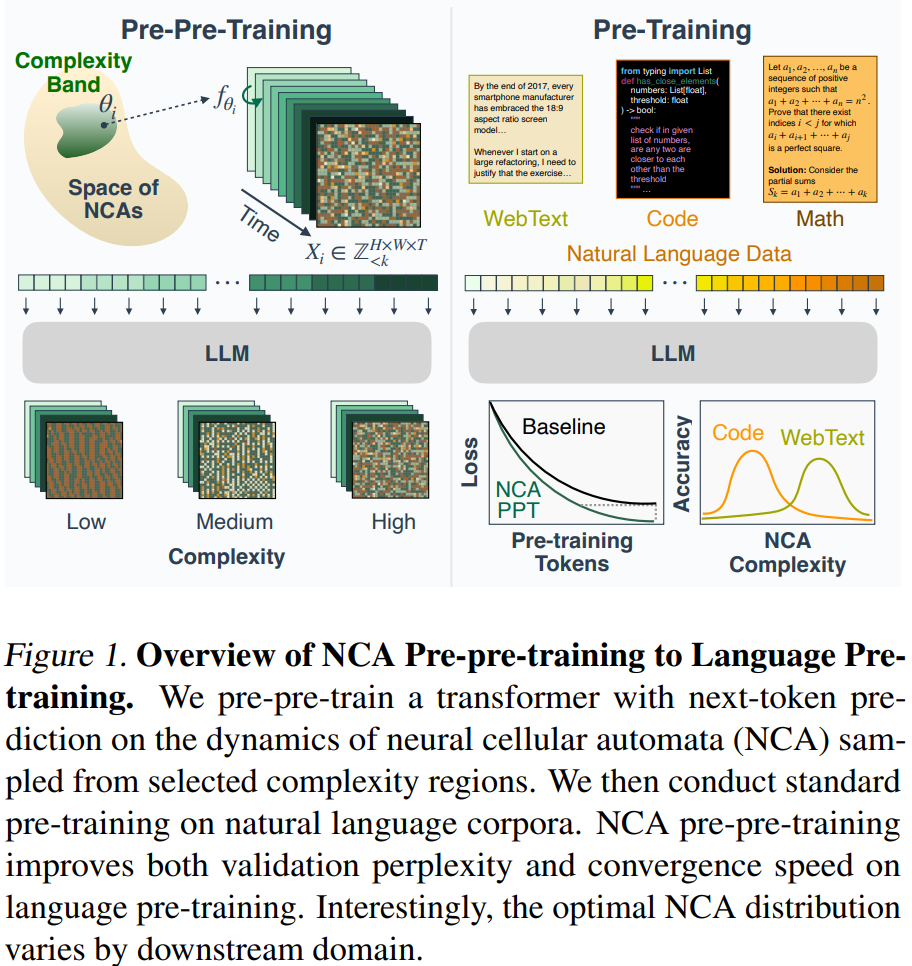 | Pre-pre-training | NCA 合成轨迹(164M tokens) | 学习可迁移的计算原语 |